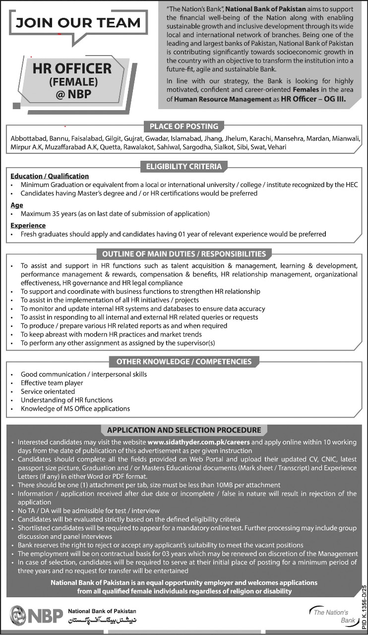 HR Officer (Female) – OG III at National Bank of Pakistan (NBP).
